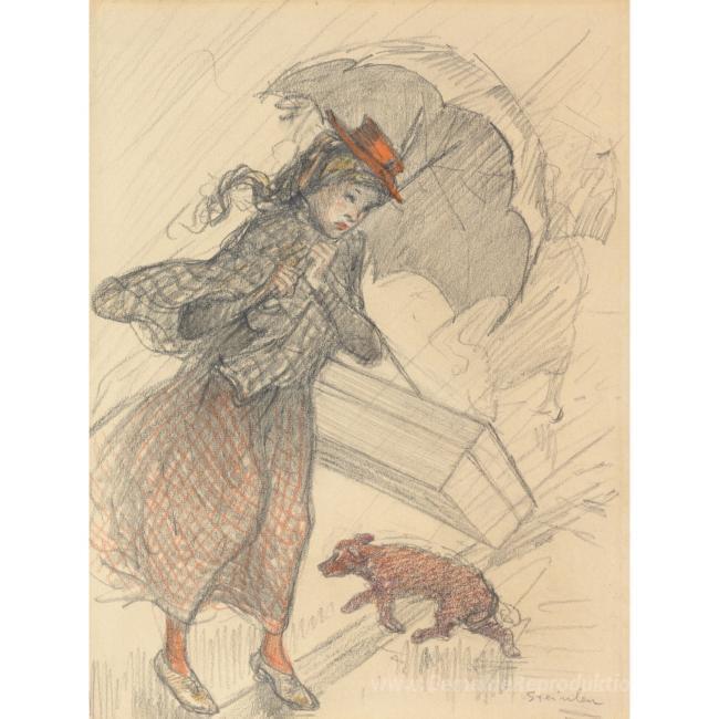 Wir bieten Ihnen eine handgefertigte Reproduktion auf Leinwand des berühmten Kunstwerks 'La Livreuse Sous la pluie' von Theophile Steinlen, aus dem Reproduktionsmuseum.