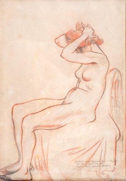 Wir bieten Ihnen eine handgefertigte Reproduktion auf Leinwand des berühmten Kunstwerks 'La Modele Nu a la Chevelure Rousse' von Theophile Steinlen, aus dem Reproduktionsmuseum.