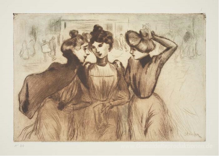 Wir bieten Ihnen eine handgefertigte Reproduktion auf Leinwand des berühmten Kunstwerks 'La Sortie des Trois LADENMÄDCHEN' von Theophile Steinlen, aus dem Reproduktionsmuseum.