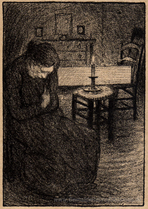 Wir bieten Ihnen eine handgefertigte Reproduktion auf Leinwand des berühmten Kunstwerks 'La Veillee' von Theophile Steinlen, aus dem Reproduktionsmuseum.