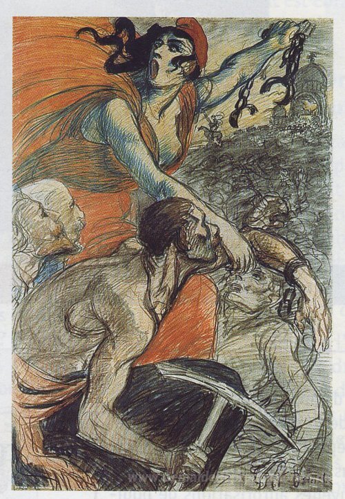 Wir bieten Ihnen eine handgefertigte Reproduktion auf Leinwand des berühmten Kunstwerks 'Laliberatrice' von Theophile Steinlen, aus dem Reproduktionsmuseum.