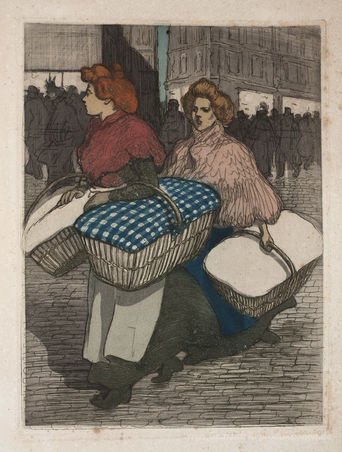 Wir bieten Ihnen eine handgefertigte Reproduktion auf Leinwand des berühmten Kunstwerks 'Laundresses tragen linnen' von Theophile Steinlen, aus dem Reproduktionsmuseum.