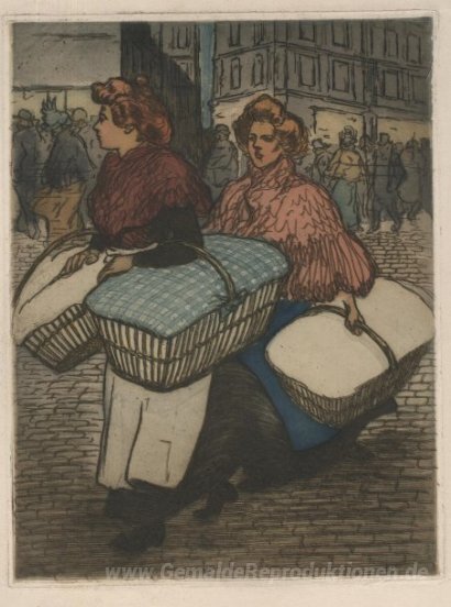Wir bieten Ihnen eine handgefertigte Reproduktion auf Leinwand des berühmten Kunstwerks 'Laundresses tragen linnen' von Theophile Steinlen, aus dem Reproduktionsmuseum.