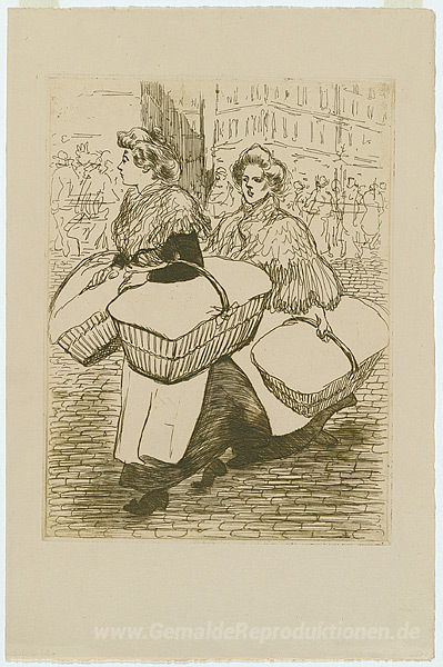 Wir bieten Ihnen eine handgefertigte Reproduktion auf Leinwand des berühmten Kunstwerks 'Laundresses tragen linnen' von Theophile Steinlen, aus dem Reproduktionsmuseum.