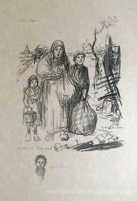 Wir bieten Ihnen eine handgefertigte Reproduktion auf Leinwand des berühmten Kunstwerks 'Le Retour - C'Est Ici Chez Nous' von Theophile Steinlen, aus dem Reproduktionsmuseum.