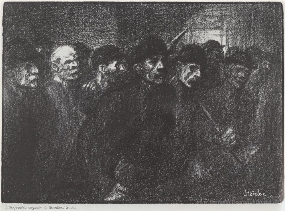 Wir bieten Ihnen eine handgefertigte Reproduktion auf Leinwand des berühmten Kunstwerks 'Ouvriers Sortant de L'Usine' von Theophile Steinlen, aus dem Reproduktionsmuseum.
