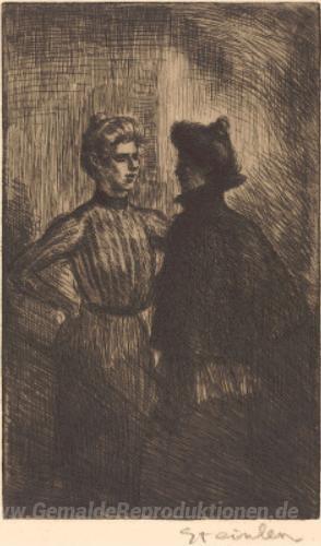Wir bieten Ihnen eine handgefertigte Reproduktion auf Leinwand des berühmten Kunstwerks 'Rencontre' von Theophile Steinlen, aus dem Reproduktionsmuseum.