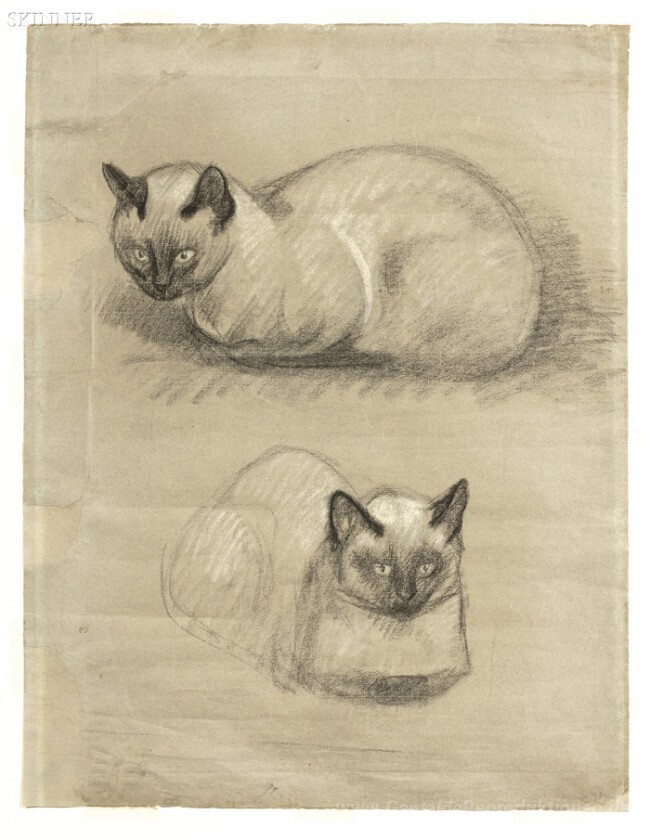 Wir bieten Ihnen eine handgefertigte Reproduktion auf Leinwand des berühmten Kunstwerks 'Siamesische Katzen' von Theophile Steinlen, aus dem Reproduktionsmuseum.