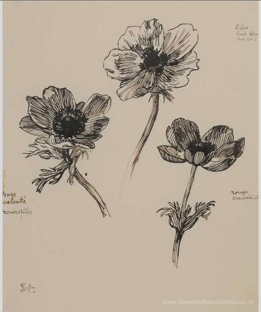 Wir bieten Ihnen eine handgefertigte Reproduktion auf Leinwand des berühmten Kunstwerks 'Trois Etudes d'Anemonen' von Theophile Steinlen, aus dem Reproduktionsmuseum.
