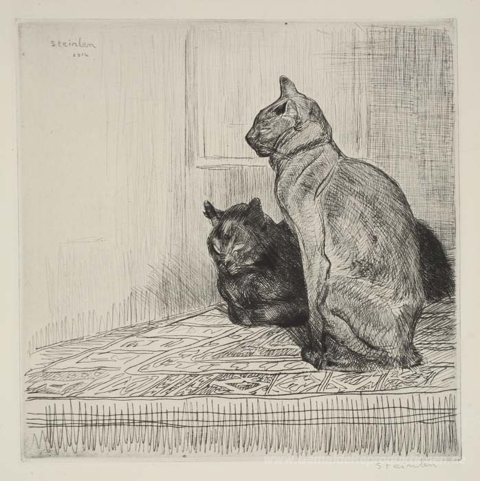 Wir bieten Ihnen eine handgefertigte Reproduktion auf Leinwand des berühmten Kunstwerks 'Zwei Katzen auf einem Schrank' von Theophile Steinlen, aus dem Reproduktionsmuseum.