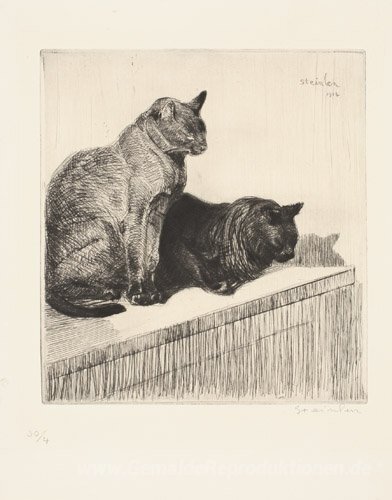 Wir bieten Ihnen eine handgefertigte Reproduktion auf Leinwand des berühmten Kunstwerks 'Zwei sitzende Katzen' von Theophile Steinlen, aus dem Reproduktionsmuseum.