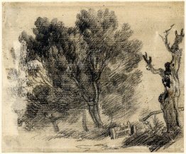 Bewaldete Landschaft mit Vieh durch einen Pool und ein Cottage a