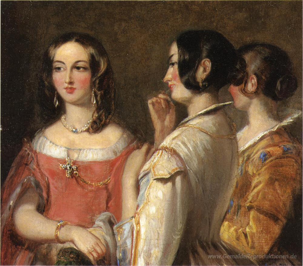 Wir bieten Ihnen eine handgefertigte Reproduktion auf Leinwand des berühmten Kunstwerks 'Klatsch' von Thomas Sully, aus dem Reproduktionsmuseum.