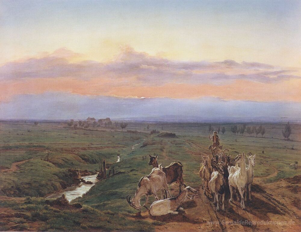 Wir bieten Ihnen eine handgefertigte Reproduktion auf Leinwand des berühmten Kunstwerks 'Abendlandschaft mit Herde von Ziegen' von Ferdinand Georg Waldmüller, aus dem Reproduktionsmuseum.