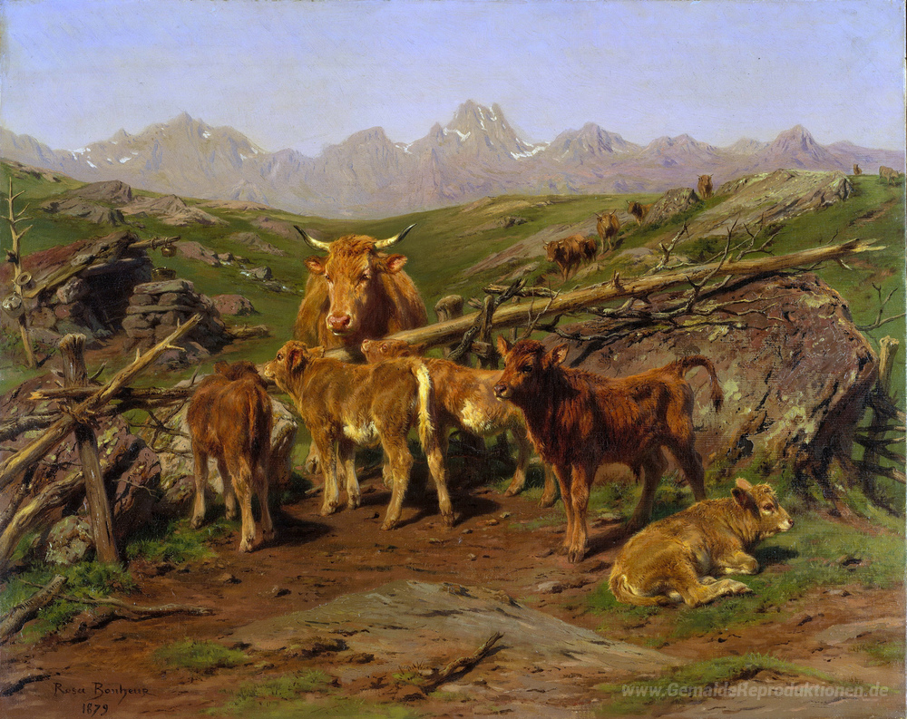 Wir bieten Ihnen eine handgefertigte Reproduktion auf Leinwand des berühmten Kunstwerks 'Absetzen der Kälber' von Rosa Bonheur, aus dem Reproduktionsmuseum.