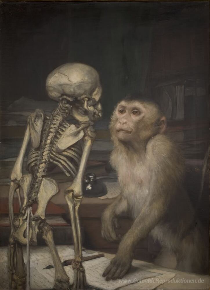 Wir bieten Ihnen eine handgefertigte Reproduktion auf Leinwand des berühmten Kunstwerks 'Affe vor Skelett' von Gabriel von Max, aus dem Reproduktionsmuseum.