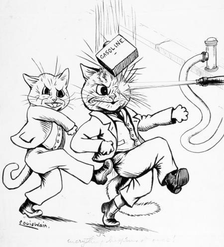 Wir bieten Ihnen eine handgefertigte Reproduktion auf Leinwand des berühmten Kunstwerks 'Alles auf einmal geschieht!' von Louis Wain, aus dem Reproduktionsmuseum.