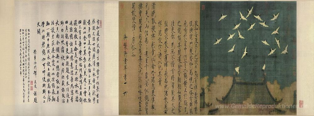 Wir bieten Ihnen eine handgefertigte Reproduktion auf Leinwand des berühmten Kunstwerks 'Auspicious Cranes' von Emperor Huizong, aus dem Reproduktionsmuseum.