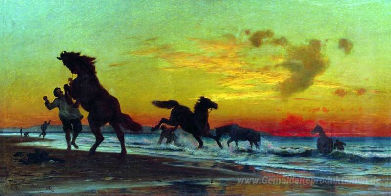 Wir bieten Ihnen eine handgefertigte Reproduktion auf Leinwand des berühmten Kunstwerks 'Bade Pferde' von Volodymyr Orlovsky, aus dem Reproduktionsmuseum.