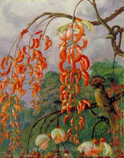 Wir bieten Ihnen eine handgefertigte Reproduktion auf Leinwand des berühmten Kunstwerks 'Blumen von einem Korallenbaum und König der Fliegenschnäpper, Br' von Marianne North, aus dem Reproduktionsmuseum.