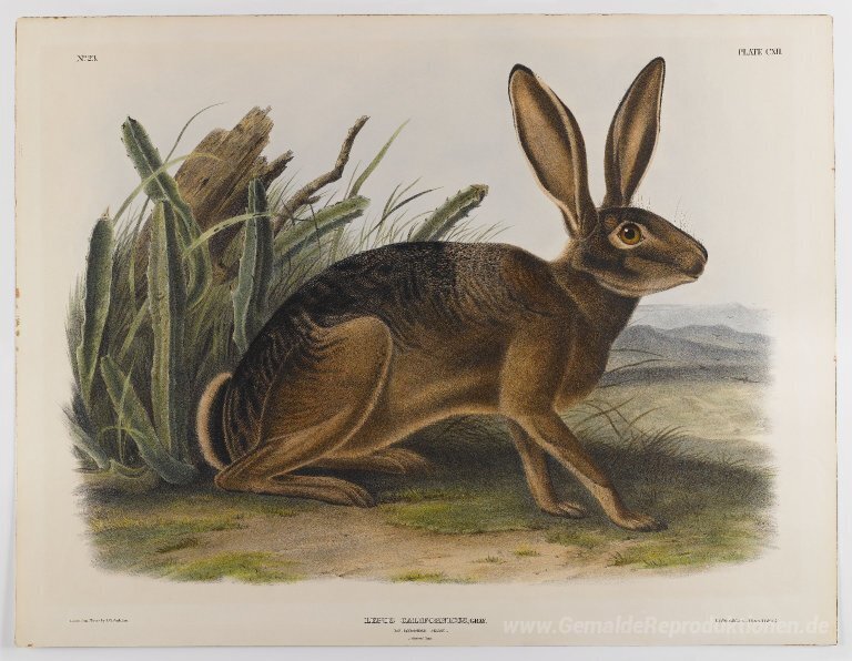 Wir bieten Ihnen eine handgefertigte Reproduktion auf Leinwand des berühmten Kunstwerks 'California Hare' von John James Audubon, aus dem Reproduktionsmuseum.