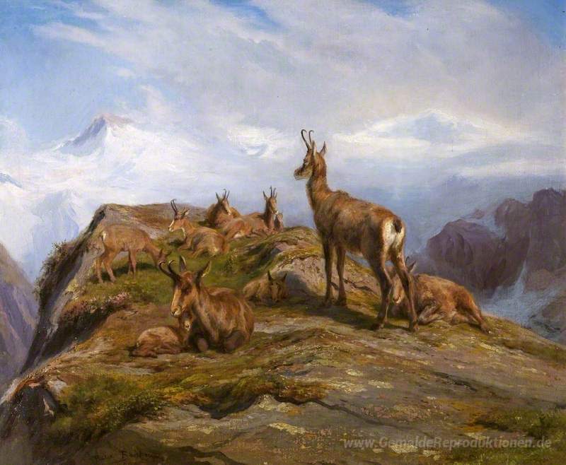 Wir bieten Ihnen eine handgefertigte Reproduktion auf Leinwand des berühmten Kunstwerks 'Chamois' von Rosa Bonheur, aus dem Reproduktionsmuseum.