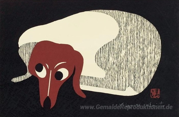 Wir bieten Ihnen eine handgefertigte Reproduktion auf Leinwand des berühmten Kunstwerks 'Dackel' von Kiyoshi Saito, aus dem Reproduktionsmuseum.
