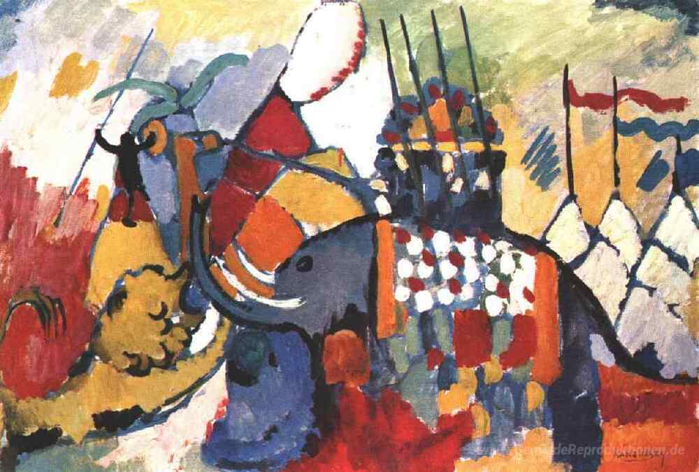 Wir bieten Ihnen eine handgefertigte Reproduktion auf Leinwand des berühmten Kunstwerks 'Der Elefant' von Wassily Kandinsky, aus dem Reproduktionsmuseum.