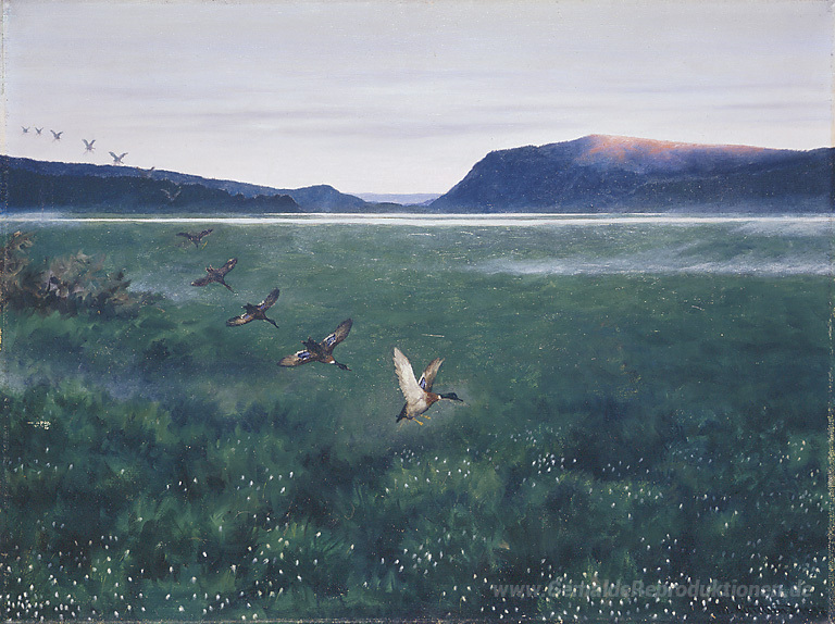 Wir bieten Ihnen eine handgefertigte Reproduktion auf Leinwand des berühmten Kunstwerks 'Die 12 Wildenten 12 villender' von Theodor Severin Kittelsen, aus dem Reproduktionsmuseum.