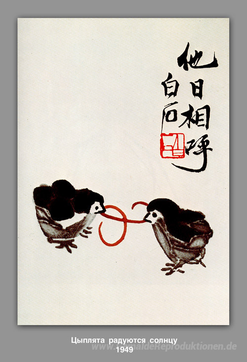 Wir bieten Ihnen eine handgefertigte Reproduktion auf Leinwand des berühmten Kunstwerks 'Die Hühner sind happy sun' von Qi Baishi, aus dem Reproduktionsmuseum.