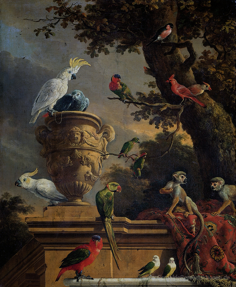 Wir bieten Ihnen eine handgefertigte Reproduktion auf Leinwand des berühmten Kunstwerks 'Die Menagerie' von Melchior d'Hondecoeter, aus dem Reproduktionsmuseum.