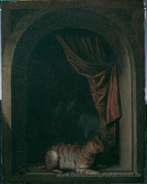 Wir bieten Ihnen eine handgefertigte Reproduktion auf Leinwand des berühmten Kunstwerks 'Eine Katze, die am Fenster eines Malerateliers' von Gerrit Dou, aus dem Reproduktionsmuseum.