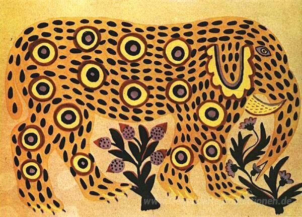 Wir bieten Ihnen eine handgefertigte Reproduktion auf Leinwand des berühmten Kunstwerks 'Elefant' von Maria Primachenko, aus dem Reproduktionsmuseum.