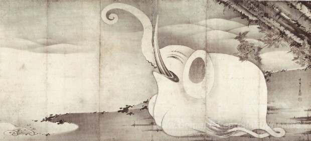 Wir bieten Ihnen eine handgefertigte Reproduktion auf Leinwand des berühmten Kunstwerks 'Elephant and Whale (diptych)' von Ito Jakuchu, aus dem Reproduktionsmuseum.