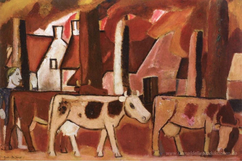 Wir bieten Ihnen eine handgefertigte Reproduktion auf Leinwand des berühmten Kunstwerks 'Führende Kühe in den Stall' von Gustave de Smet, aus dem Reproduktionsmuseum.