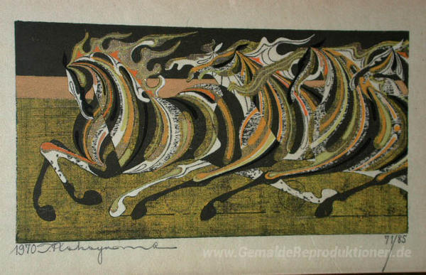 Willkommen in unserer exklusiven Sammlung von Ölgemälden, in der Kunst und Emotion miteinander verschmelzen. Eines der herausragendsten Werke ist Fünf Pferde laufen von dem renommierten Künstler Tadashi Nakayama. Nakayama, bekannt für seinen einzigartigen Stil und seine beeindruckenden Techniken, hat in diesem Werk die Eleganz und Dynamik der Natur eingefangen. Die fließenden Pinselstriche und die lebendige Farbpalette erzeugen eine kraftvolle Darstellung der Pferde, die den Betrachter in ihren Bann zieht.