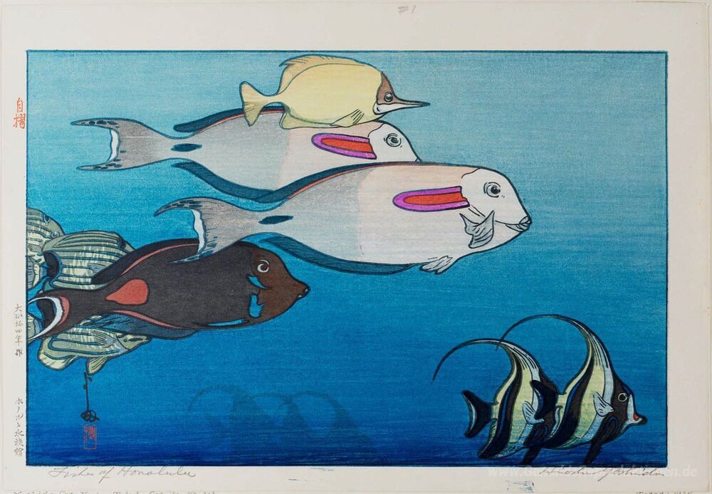 Wir bieten Ihnen eine handgefertigte Reproduktion auf Leinwand des berühmten Kunstwerks 'Fische von Honolulu' von Hiroshi Yoshida, aus dem Reproduktionsmuseum.