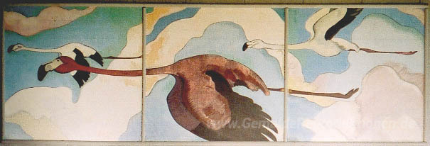 Wir bieten Ihnen eine handgefertigte Reproduktion auf Leinwand des berühmten Kunstwerks 'Flamingos im Flug' von Arman Manookian, aus dem Reproduktionsmuseum.