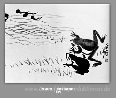 Wir bieten Ihnen eine handgefertigte Reproduktion auf Leinwand des berühmten Kunstwerks 'Frösche und Kaulquappen' von Qi Baishi, aus dem Reproduktionsmuseum.