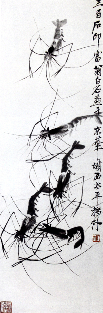 Wir bieten Ihnen eine handgefertigte Reproduktion auf Leinwand des berühmten Kunstwerks 'Garnele' von Qi Baishi, aus dem Reproduktionsmuseum.