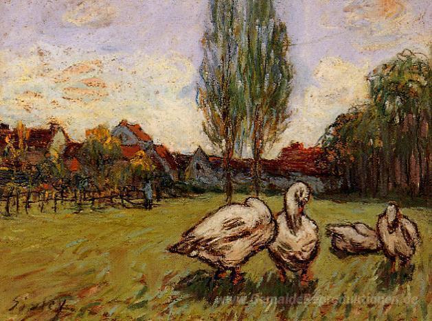 Wir bieten Ihnen eine handgefertigte Reproduktion auf Leinwand des berühmten Kunstwerks 'Geese' von Alfred Sisley, aus dem Reproduktionsmuseum.