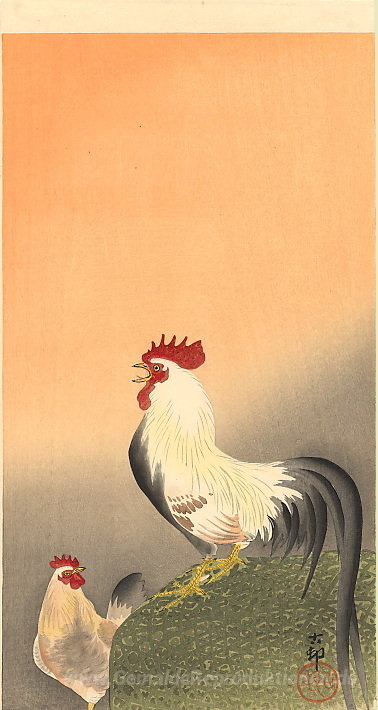 Wir bieten Ihnen eine handgefertigte Reproduktion auf Leinwand des berühmten Kunstwerks 'Hahn und Henne im Sunrise' von Ohara Koson, aus dem Reproduktionsmuseum.
