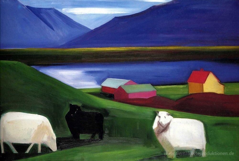 Wir bieten Ihnen eine handgefertigte Reproduktion auf Leinwand des berühmten Kunstwerks 'Haus und Schafe' von Louisa Matthiasdottir, aus dem Reproduktionsmuseum.