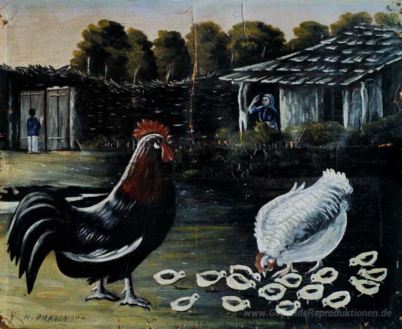 Wir bieten Ihnen eine handgefertigte Reproduktion auf Leinwand des berühmten Kunstwerks 'Henne mit ihren Küken' von Niko Pirosmani, aus dem Reproduktionsmuseum.
