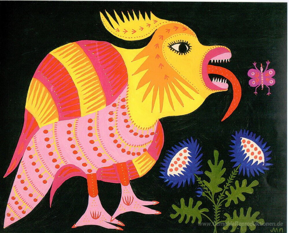 Wir bieten Ihnen eine handgefertigte Reproduktion auf Leinwand des berühmten Kunstwerks 'Junge Elster fängt eine Grub' von Maria Primachenko, aus dem Reproduktionsmuseum.