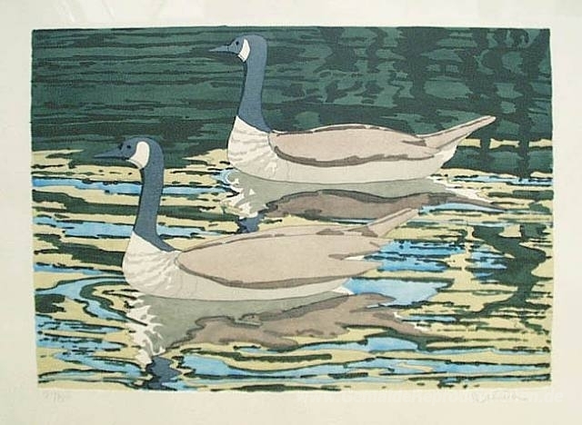 Wir bieten Ihnen eine handgefertigte Reproduktion auf Leinwand des berühmten Kunstwerks 'Kanadische Gänse' von Neil Welliver, aus dem Reproduktionsmuseum.
