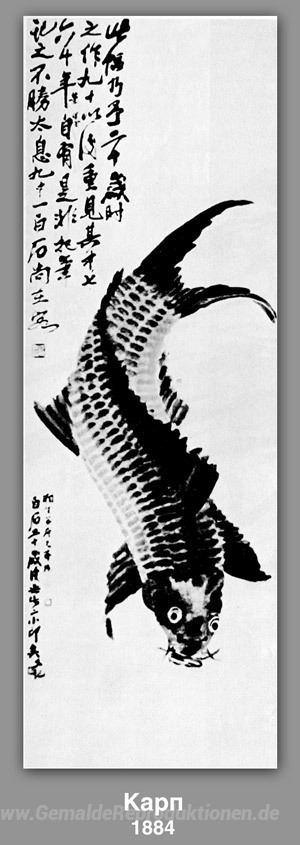 Wir bieten Ihnen eine handgefertigte Reproduktion auf Leinwand des berühmten Kunstwerks 'Karpfen' von Qi Baishi, aus dem Reproduktionsmuseum.