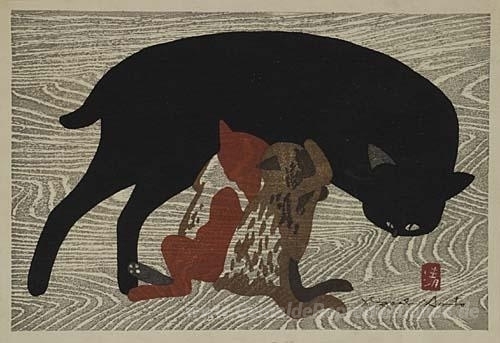 Wir bieten Ihnen eine handgefertigte Reproduktion auf Leinwand des berühmten Kunstwerks 'Katze und Kätzchen' von Kiyoshi Saito, aus dem Reproduktionsmuseum.