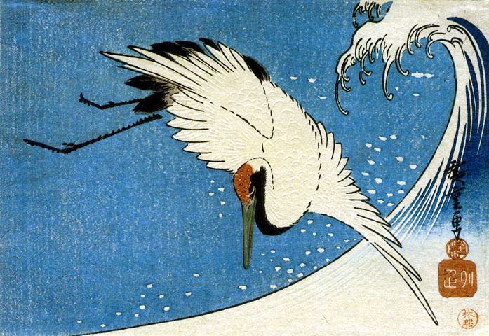 Wir bieten Ihnen eine handgefertigte Reproduktion auf Leinwand des berühmten Kunstwerks 'Kran und Welle' von Hiroshige, aus dem Reproduktionsmuseum.