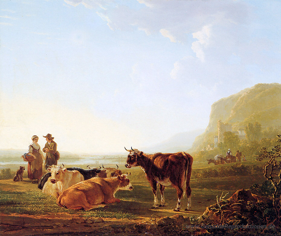 Wir bieten Ihnen eine handgefertigte Reproduktion auf Leinwand des berühmten Kunstwerks 'Landschaft mit Kühen Ruhe' von Jacob van Strij, aus dem Reproduktionsmuseum.